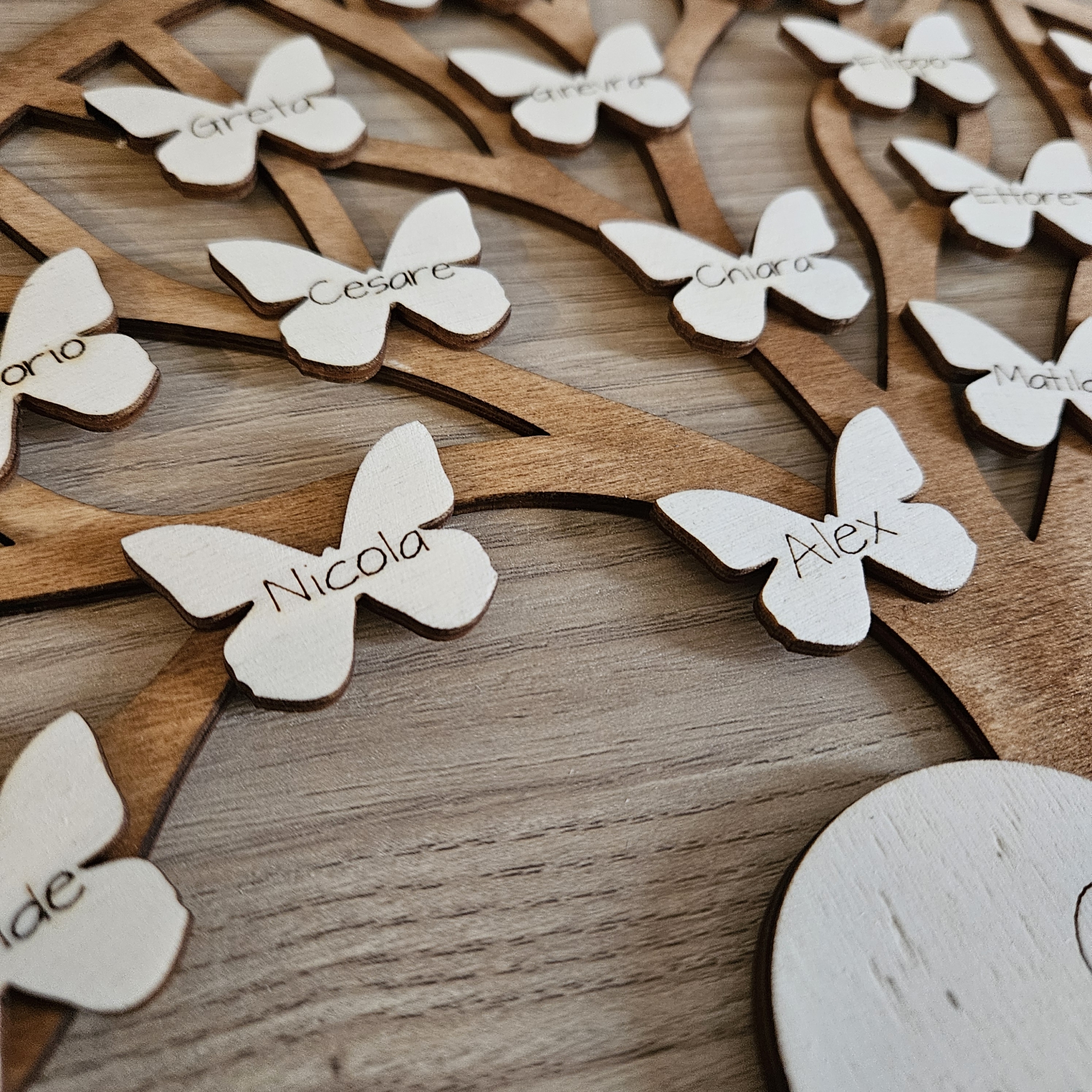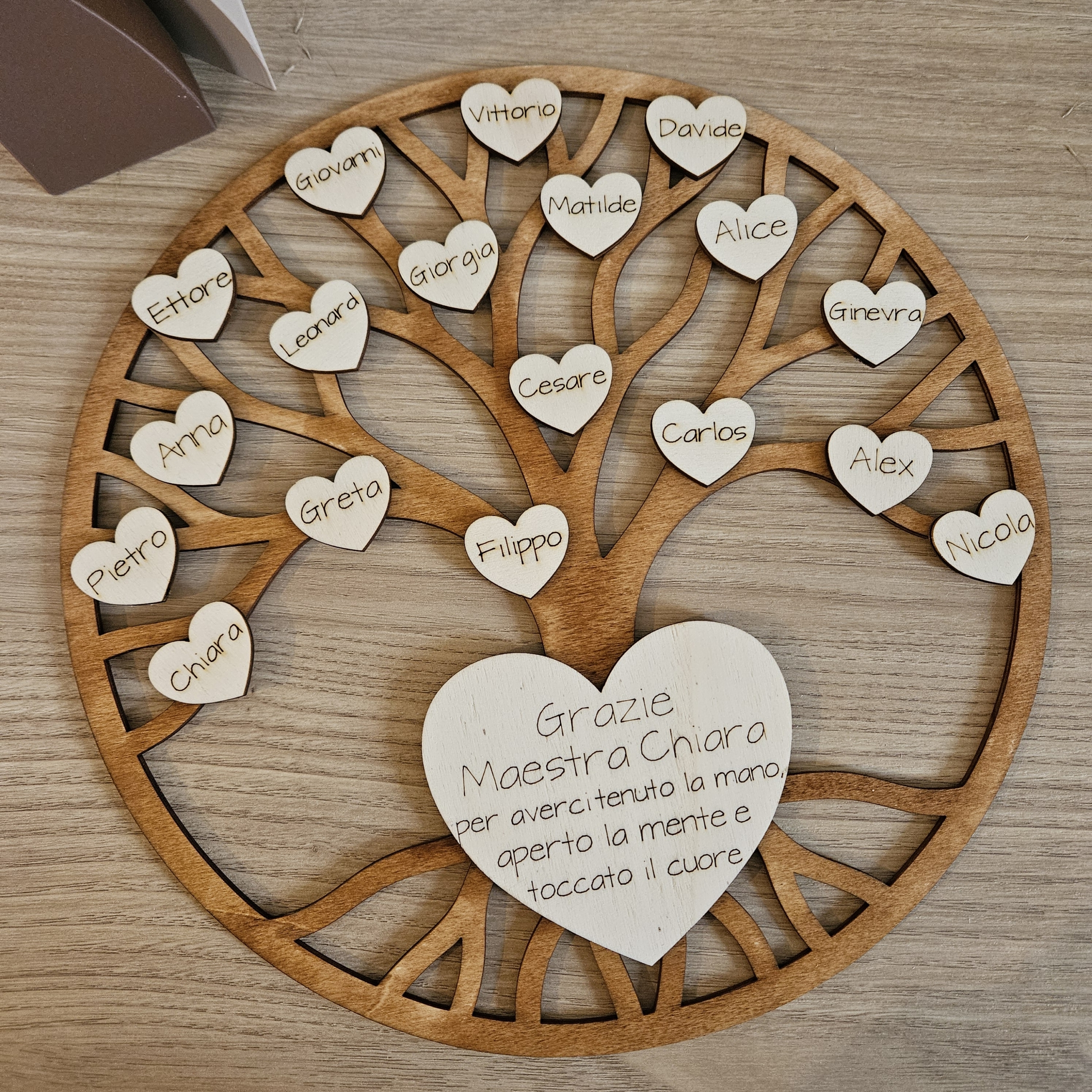 Disponibilitá: DISPONIBILE | Codice Prodotto: O16RCAlbero della vita in legno di pioppo con cuoricini o farfalle in rilievo con nome dei bimbi e della maestra incisi.