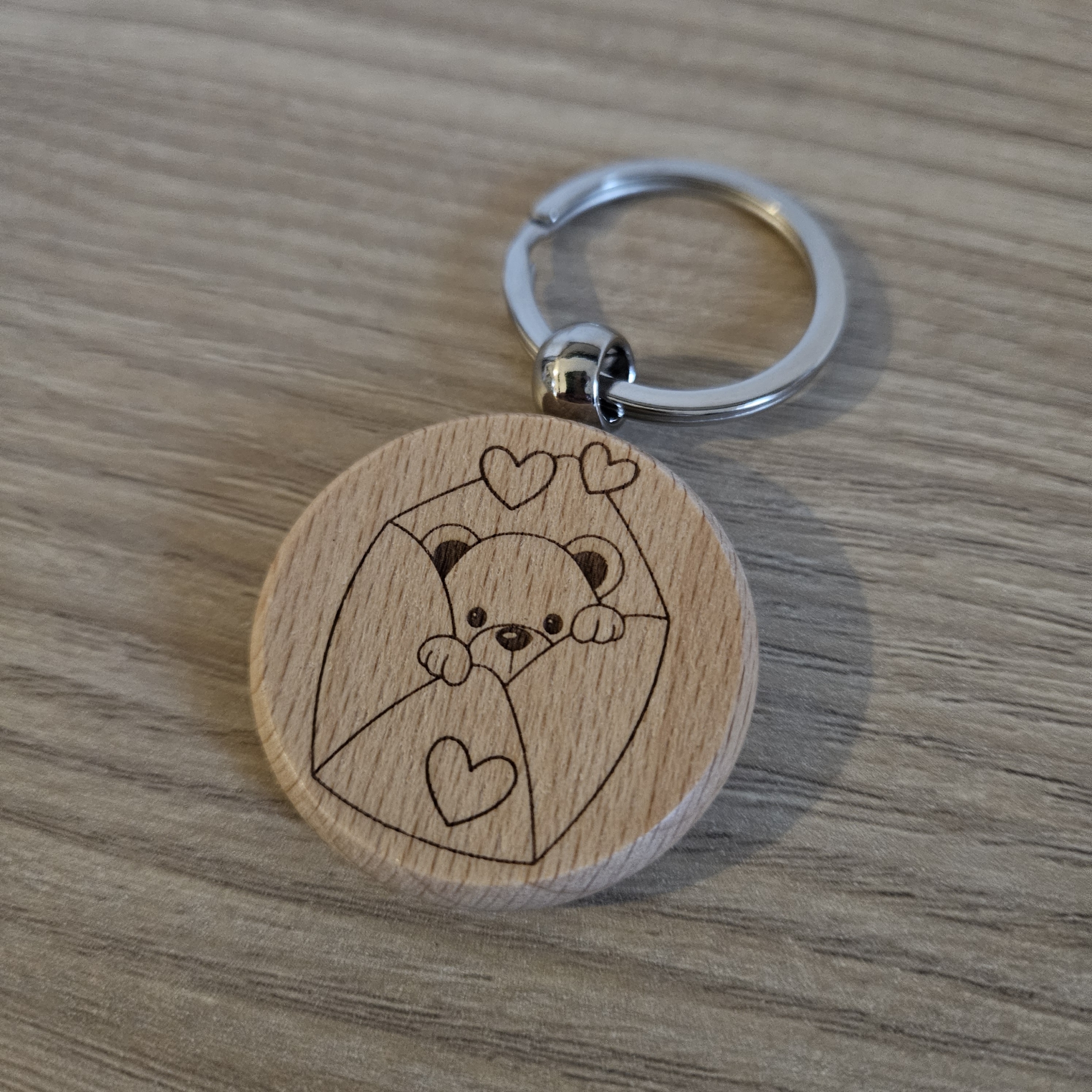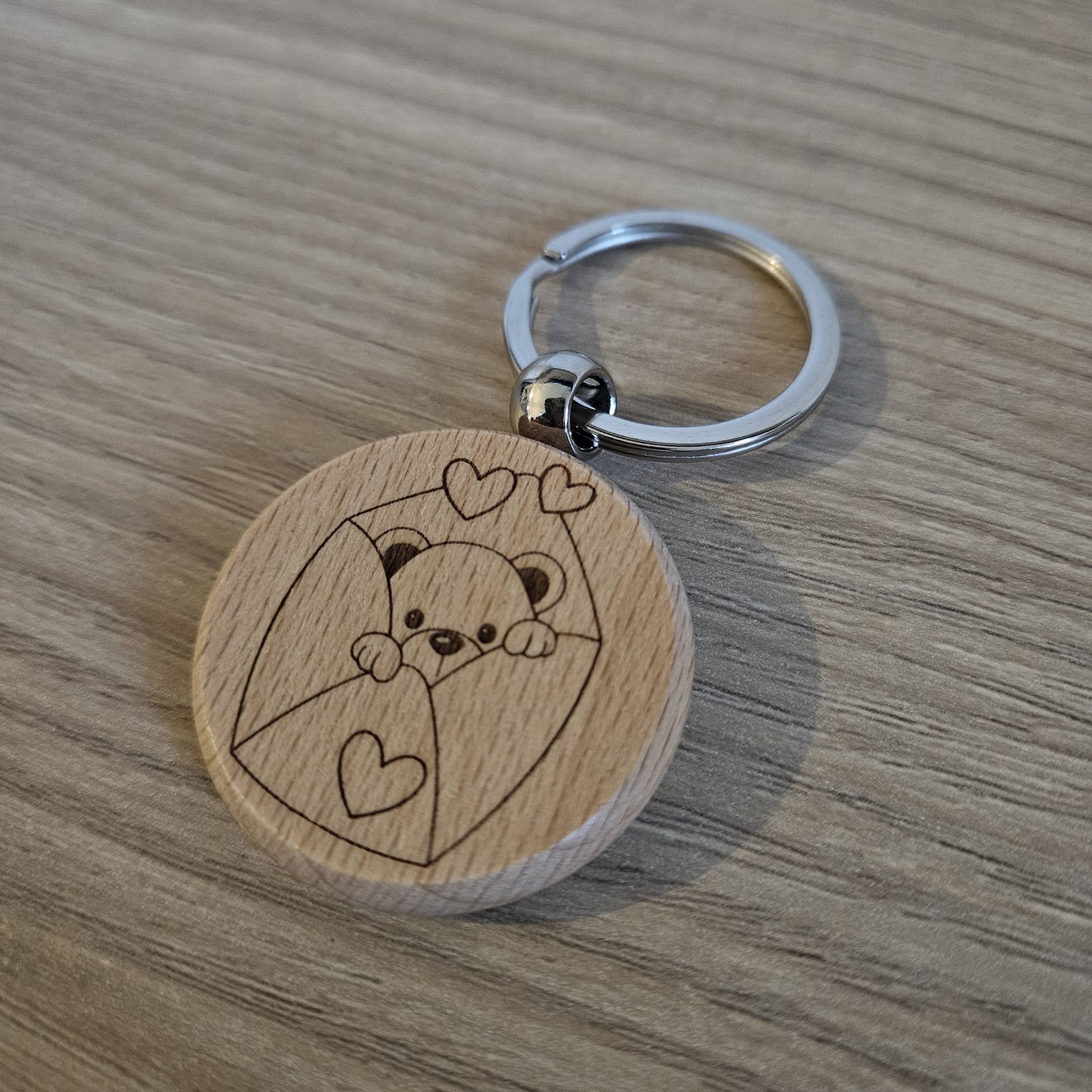 Disponibilitá: DISPONIBILE | Codice Prodotto: UGZ53-2Portachiavi in legno di faggio rotondo “Orsetto con letterina e cuori”